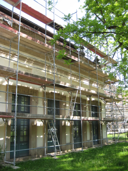 Einrüstung eines historisch wertvollen Gebäudes in LK 4, W09 an stark gegliederter Fassade, teilw. überdacht
